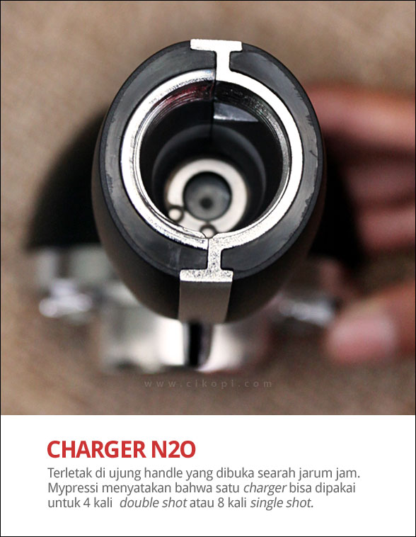 - Bagaimana dengan tekanan yang dihasilkan karena catridge N20 tekananannya pasti melebihi 135 psi, sebuah angka ideal untuk ekstraksi espresso ? Mypressi sudah dilengkapi dengan pengatur (pressure regulator) untuk menurunkan tekanan dari 600psi menjadi 135psi.