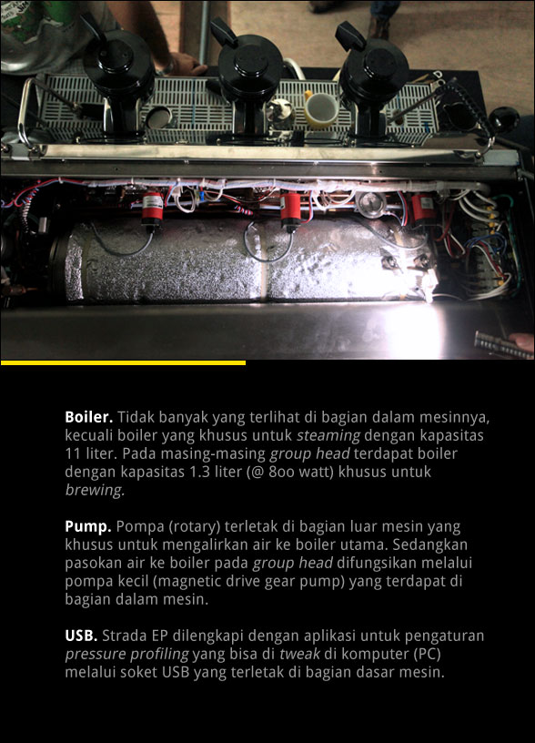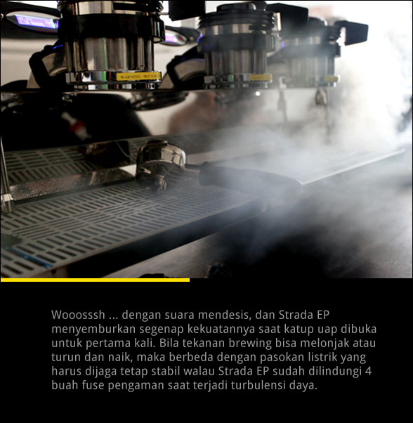 Pertanyaannya, mengapa memilih Strada yang beratnya mencapai 90 kg ? “Mengapa tidak ?, tapi menurut konsultannya 1/15, La Marzocco adalah “it’s a vey long established brand” dan banyak “kyai” lulusan perusahaan ini kemudian berhasil mendirikan perusahaan mesin espresso yang nama-namanya sudah saya sebutkan di atas (La Mrazocco didirkan tahun 1927 dan berpusat di kota Florence Italia). Selain itu, niatan untuk memahami kopi lebih mendalam bisa diwujudkan dengan berbagai parameter yang terdapat dalam fitur mesin Strada.