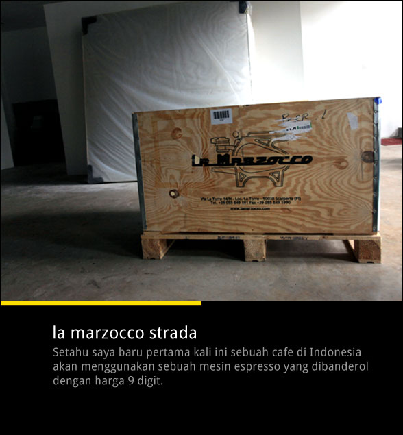 Kabar baiknya, La Marzocco Strada sudah mendarat dengan selamat di Jakarta, tapi sayangnya jam’iyah blog cikopi masih belum bisa menikmati kucuran kopi dari salah satu mesin espresso langitan ini, setidaknya hingga akhir Mei yang akan datang. Sebuah cafe di jalan Gandaria, Jakarta Selatan akan menjadi rumah baru bagi Strada tipe electronic paddle, setahu saya ini yang pertama di Indonesia. Gizmodo menyebutnya sebagai the new wet dream machine, tapi saya lebih senang dengan istilah espresso orgasmic untuk sebuah mesin yang juga digunakan oleh nama besar sekelas Intelligentsia. Sensual bukan ? 😀 Mari kita telanjangi . . .