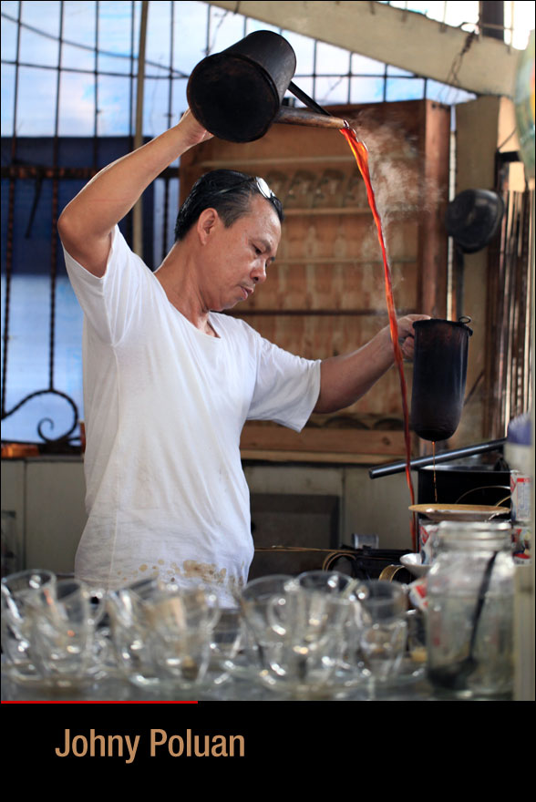 More often than not, the discovery of a coffee shop that totally captures your heart comes in the most unexpected way, and Kwang Koan – meaning “a gathering place” –is definitely it. This coffee shop is not your typical glamorous hang-out place with expensive coffee machines; the owner Johnny Poluan is usually dressed in a thin, white cotton shirt or a white singlet undershirt – those are his typical attires he wears while serving the customers. But come breakfast time, Kwang Koan (which is located on Jalan Kopyor Raya block Q1 No. 1, exactly on the corner of the street) is packed, and you can see rows after rows of cars parked neatly along the street, and they all belong to the patrons of Kwang Koan who impatiently wait for vacant tables.