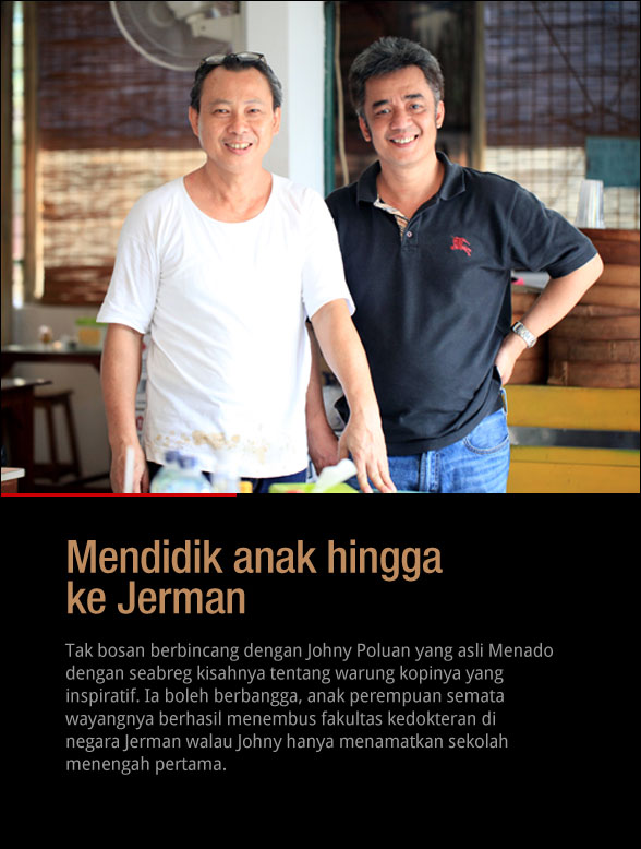 Walau warung kopinya ramai, secara berseloroh Johny tak ingin main di puncak dan cukup di lereng atau ia sudah cukup puas dengan apa yang ia peroleh saat ini. Ia memang sudah berencana untuk pindah ke tempat yang lebih permanen, tapi untuk sementara sebuah rumah berupa teras dan ruangan tengah yang berpendingin masih dirasakan cukup.