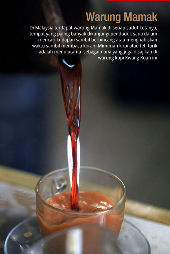 Mamak stalls. In Malaysia there is a Mamak stall in every corner of the city – they’re the most frequented places where people enjoy all kinds of snacks while chatting to each other, or simply spend some quality-time reading the paper. Coffee beverages and Chai teas are the main menus, and they are available at Kwang Koan.