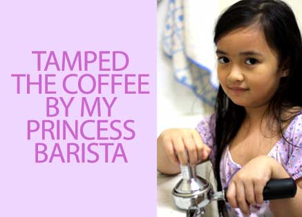 Nah, anah saya satu2nya, si cantik yang kami panggil Nona sudah siap dengan portafilter Rancilio dan tamper alumunium yang berat. Ngomong2 ia sudah mulai bisa menikmati cappuccino dan sering membantu saya menyiapkan kopi espresso. Oh ya, sebelumnya kopi luwak saya giling agak sedikit halus untuk mesin espresso. (cupping biasanya tidak dilakukan dengan mesin espresso, tapi karena rasanya saya lebih mengenal rasa kopi lewat pekatnya minuman ini, maka saya lebih menyukai metode ini. Selain itu ilmu cupping saya belum mumpuni.
