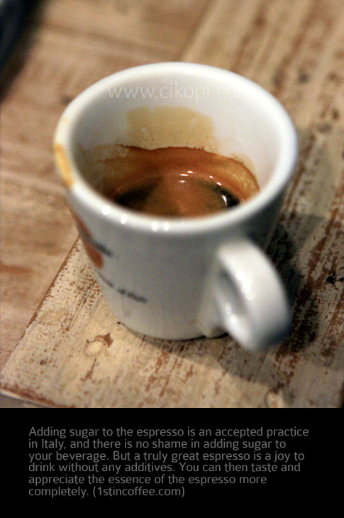 Saya selalu ditanya apakah boleh menambahkan gula ke espresso ? Saya kira jawaban di atas bisa membantu pembaca untuk memutuskan apakah mau atau tidak memberi sedikit pemanis dalam minuman espresso kita. Tidak ada aturan baku yang menyebutkan bahwa kalau anda minum espresso “haram” menambahkan gula.