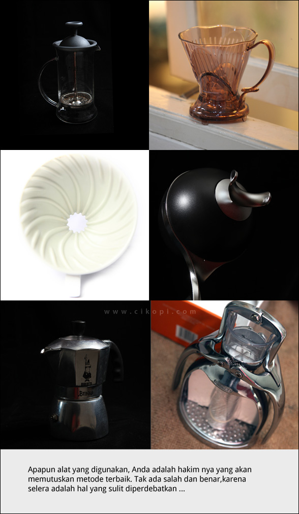 Alatnya? Tergantung… Sehari2 di rumah pakai coffee maker KRUPS standar buat bikin espresso/latte/capucccino. Sebulan sekali mesin ini saya bawa ke kantor untuk bikinin kopi buat teman2 dosen di UI di acara lunch bareng. Kalau ngopinya ditemani makanan tradisional (combro, singkong, tahu sumedang, dll), lebih enak bikin black coffee pakai french press saja. Kalau untuk sendirian, kadang2 bikin black coffee pakai Bialetti kecil.