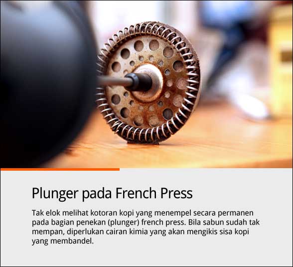 Coba perhatikan plunger pada french press terutama pada bagian penyaringnya. Di sela-selanya terkumpul sisa-sisa kopi hasil seduhan terdahulu yang warnanya semakin lama terlihat coklat hingga kehitaman.