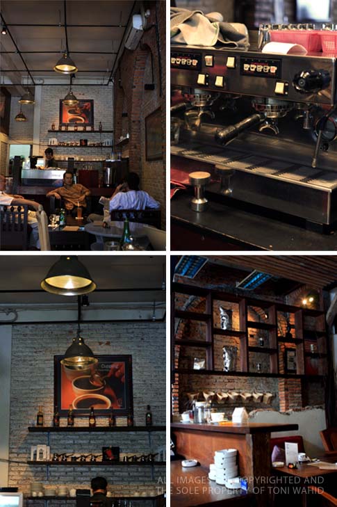 Ada dua hal yang membuat saya langsung terkesan saat pertama memasuki cafe ini. Pertama, konsep cafe dengan desain interior yang feel homy. Ruangan cafe yang lebarnya kira2 lima meter dihiasi dengan berbagai aksesoris unik seperti karung kopi, sofa bergaya retro, lantai berwarna natural, dan dinding tanpa plester. Satu hal menonjol, sebuah mesin untuk roasting kopi di letakan di sudut ruangan yang saya asumsikan dioperasikan agar pengunjung bisa melihat secara langsung proses “memasak” kopi.