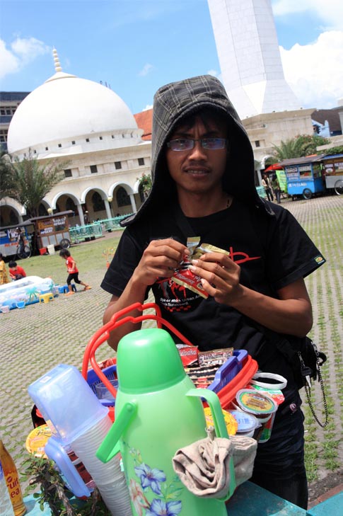 Bisnis kopi bukan hanya ada di cafe atau mall, siapapun bisa mengelola bisnis ini pun dengan modal seadanya. Lihat saja si Mas ini menjajakan kopi di pelataran masjid Agung Bandung yang menjualnya seharga 2000 per gelas.