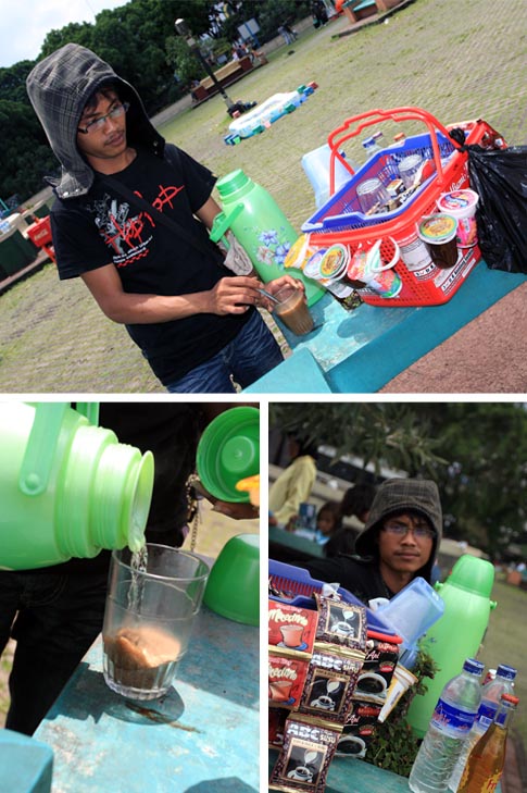 di jakarta juga ada penjual kopi jalanan seperti itu. Sekitar Thamrin-Sudirman. Biasanya mereka jalan atau naik sepeda. Harganya kurang lebih sama. saya pernah nyobain sekali. Hmm, lumayan kalo lagi males manasin air buat nyeduh energen. 🙂