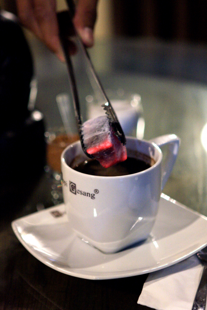 Saat kopi sudah disajikan seorang pelayan membawa sebongkah arang dengan penjepit dan memasukan perlahan ke dalam kopi kami. Jooosh … begitu mungkin suara yang terdengar saat bara dari arang mulai dicelupkan ke dalam kopi.