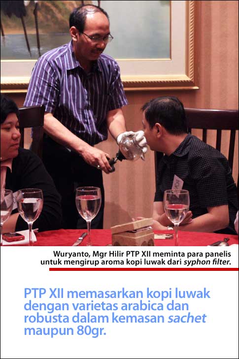 Saya diundang sebuah perusahaan Marketing Research di Jakarta bersama sembilan orang panelis lainnya untuk berdiskusi sekalian mencicipi kopi luwak. Acara ini sebenarnya merupakan bagian dari strategi marketing yang akan dikembangkan oleh perusahaan tersebut berdasarkan masukan2 dari orang awam termasuk saya yang kebetulan menggemari minuman kopi. Singkat kata setelah acara berlangsung beberapa lama baru kami ketahui bahwa perusahaan kopi tersebut adalah dari PT Perkebunan XII di daerah Jawa Timur.