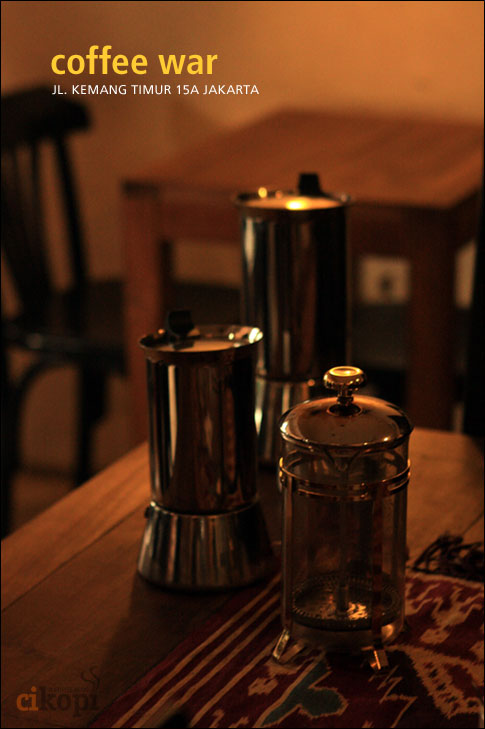 Bosan dengan cafe yang kopinya terlalu Amerika atau terlalu Itali ? Mengapa tidak mencoba Coffee War, sebuah rumah kopi di Jl. Kemang Timur 15A, Jakarta Selatan. Dikelola oleh Sumule bersaudara, Derby dan Yogi, yang hanya menyediakan kopi dari Indonesia dan tanpa mesin espresso sebagaimana yang biasa terdapat di cafe modern lainnya. Di senja hari Jum’at tadi saya berbincang dengan Derby ditemani secangkir kopi tubruk panas dari Mandheling.