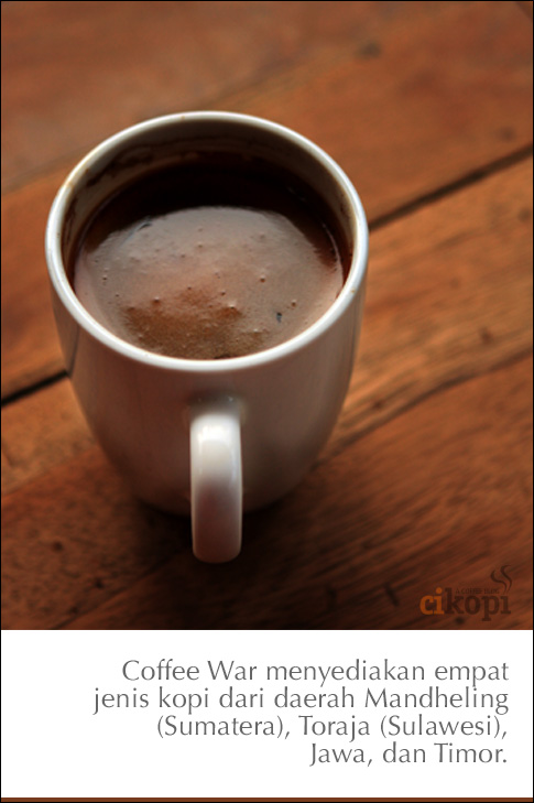 Coffee War, baru dibuka sejak Januari tahun 2009 ini menempati lahan sekitar kurang dari 100 meter tidak sulit untuk ditemukan. Kapasitas tempat duduknya maksimal 30 orang dan hampir selalu dipenuhi para pecinta minuman kopi tubruk. Mereka memang tidak menyediakan mesin espresso hanya tiga alat penyeduh kopi yakni moka pot, french press, dan ibrik.