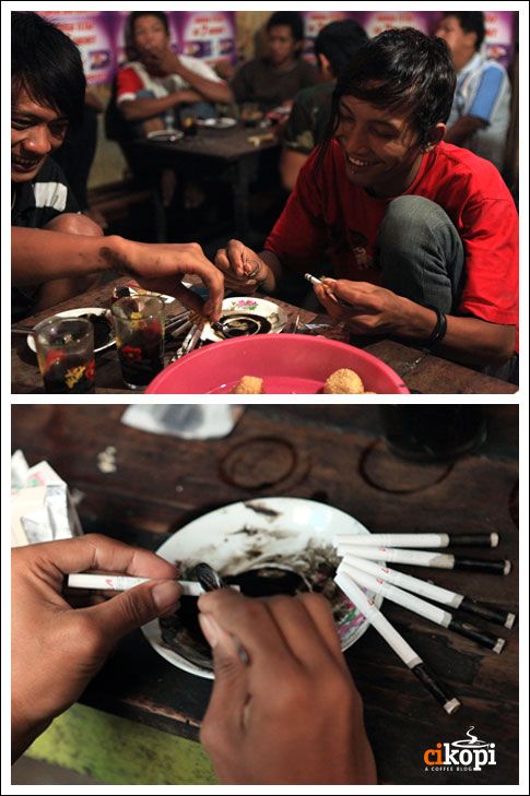 Saat ditanyakan kepada sebagian pengunjung, tidak ada yang tahu kapan aktivitas ngopi ala Tulungagung ini dimulai. Mereka hanya mengikuti kebiasaan yang telah diturunkan dari orang tuanya. Lalu apa enaknya sebatang rokok yang dilaburi cethe ? Sebagian dari mereka mengatakan bahwa kopi membuat rasa rokok lebih mantap dan tidak cepat habis. Sehari mereka bisa menghabiskan waktu setidaknya antara 2 hingga 3 jam di tempat ini. Tidak ada tujuan khusus selain mengisi waktu luang dimana nyethe sudah melekat menjadi tradisi lokal sebagaimana warung ini yang sudah buka sejak tahun 1975. Tentu saja kunjungan ini sangat berkesan, terlebih kami berlima menjadi pemandangan “aneh” terlebih saya yang hilir mudik mengabadikan kegiatan mereka dengan kamera DSLR.