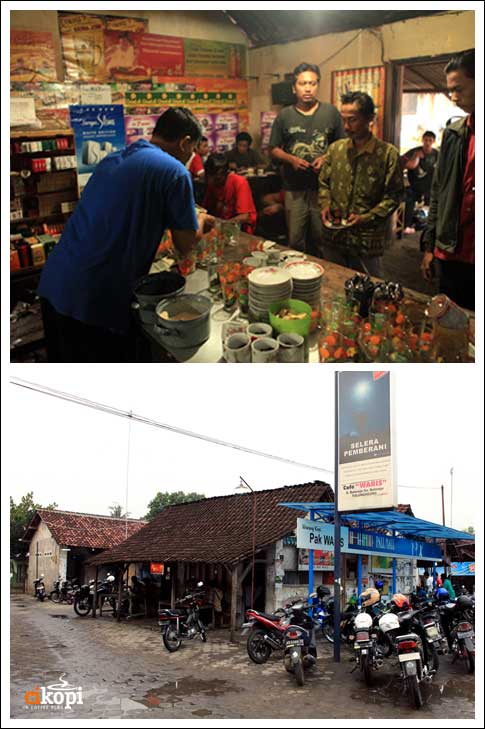 Di depan cafe, kami langsung disambut dengan pemandangan unik dimana ratusan orang terutama anak2 muda yang didominasi kaum pria berkumpul sambil menikmati kopi dan melakukan aktivitas nyethe. Tidak ada code dress untuk masuk ke warung “Pak Waris”, semua serba kasual, celana selutut, sarungan, kaus oblong, dan sandal jepit bukanlah barang haram di sini. Pengunjung umumnya duduk di kursi2 yang sudah disediakan di dalam warung, sebagian lagi selonjoran di luar dan gazebo kecil. Tidak dilarang duduk sambil mengangkat satu kaki atau tiduran seperti yang dilakukan sekelompok pemuda di pojok warung ini.