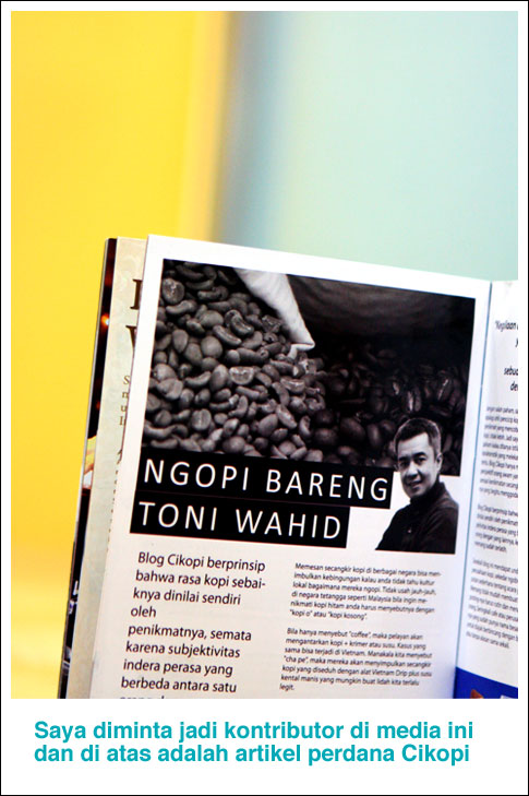 Oh ya, pihak redaksi sudah meminta blog ini menjadi kontributor tetap dengan headline “Ngopi bersama Toni Wahid” 🙂 Di majalah ini saya bercerita tentang awal mula blog ini plus suka duka sebagai seorang coffee blogger yang berangkat dari kecintaan terhadap kopi Indonesia yang luar biasa nikmat dan beragamanya.