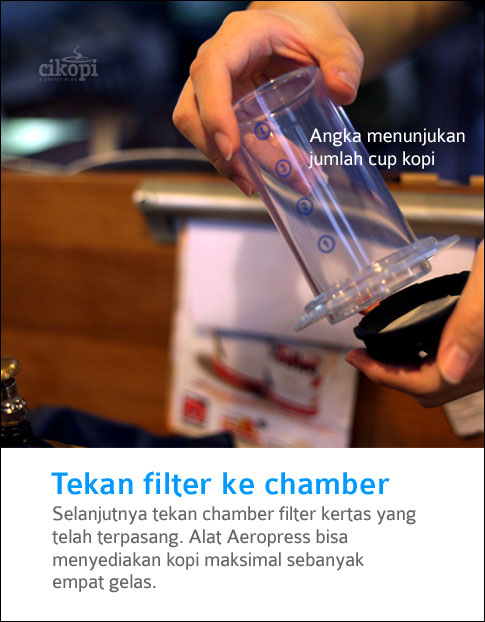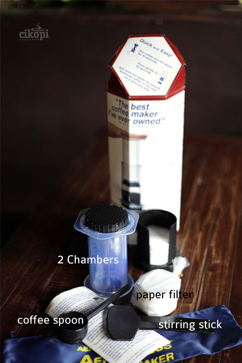 Apabila kardusnya dibuka terlihat kit dari AeroPress yang terdiri dari : chamber atau tabung kopi, filter kertas, alat pengaduknya, serta satu sendok takaran kopi bubuk. Satu alat lagi yang tidak terlihat adalah funnel, semcam corong untuk mengalirkan air panas. Cukup sederhana dan kesemuanya materialnya terbuat dari plastik yang membuat harganya cukup terjangkau. Di bawah ini adalah tata cara selengkapnya yang mudah dilakukan tanpa harus melakukan berbagai tweak seperti pembuatan espresso. Fotonya semoga bisa menjelaskan alur pembuatan kopi dengan AeroPress di bawah ini :