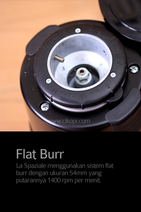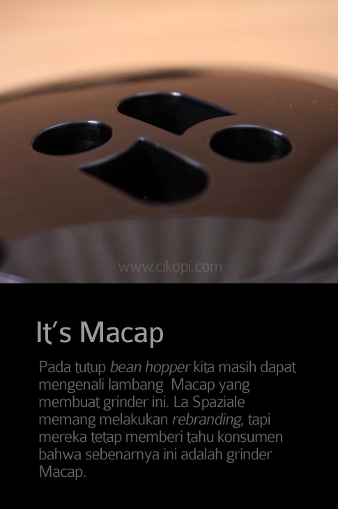 La Spazialle masih membiarkan lambang Macap terpampang di atas tutup bean hopper grinder ini sehingga konsumen akan langsung mengetahui bahwa mereka membeli merek Macap tipe M4.