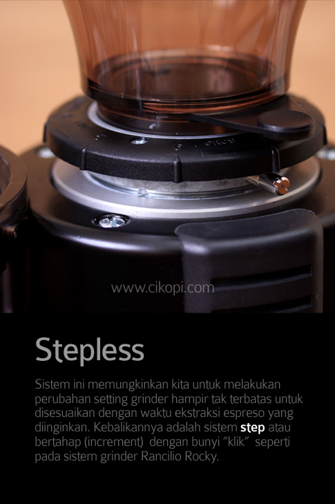 Di bawah ini adalah pengenalan sebuah mesin grinder yang menurut saya merupakan pesaing utama Mazzer, bukan hanya dari dari segi harga, tapi juga dari faktor berbagai fitur tambahan sebagai nilai plus selain kemudahan setting sistem stepless-nya.