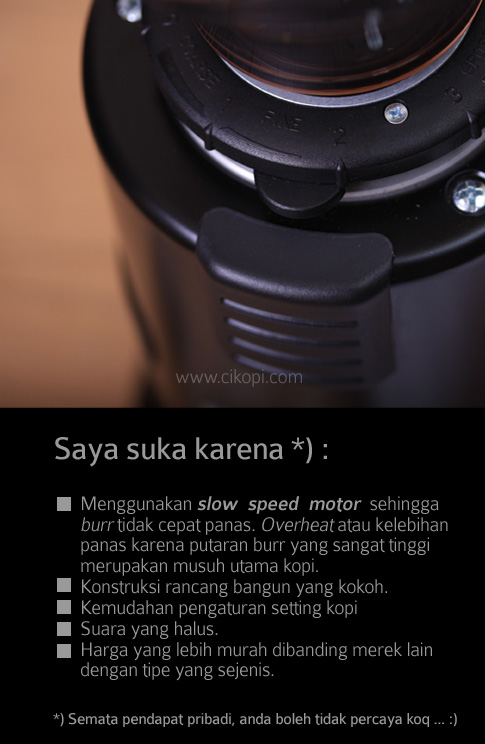 Kemudahan setting, penggunaan slow speed motor sehingga suaranya sangat halus, dan tentu saja faktor harga yang lebih murah dibanding dengan grinder merek lain yang sejenis.