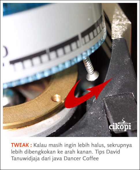 Menurut David Tanuwijaya dari Java Dancer Coffee yang juga memiliki grinder ini, hasilnya masih bisa diperhalus dengan membengkokan sekrup di bawah kontainer, tapi saya belum melakukan ini.