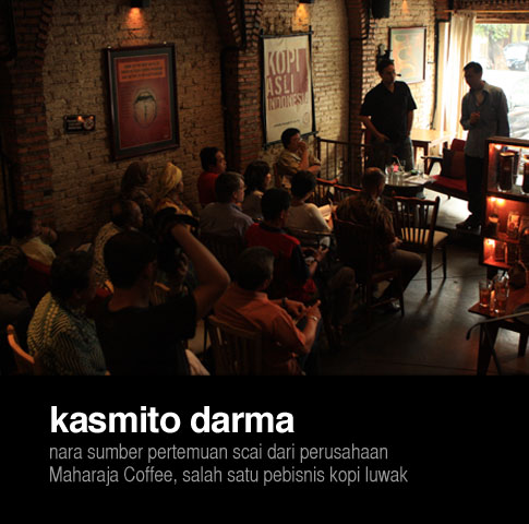 Pertanyaan tersebut menjadi awal sebuah diskusi hangat termasuk sistem budidaya dan produksi kopi luwak, karakter kopi, metode roasting, hingga penjualan ke konsumen.