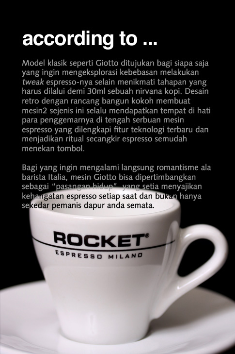 Tidak akan pernah ada sebuah mesin espresso yang sempurna, selalu ada keinginan para konsumen untuk terus menaikan spesifikasi dan fitur teknologi dengan harga serendah mungkin. Dari pengalaman beberapa hari menggunakan Giotto, mesin ini sudah lebih dari cukup untuk keperluan di rumah saya atau cafe kecil, serta restoran yang menyajikan kopi sebagai side dish.