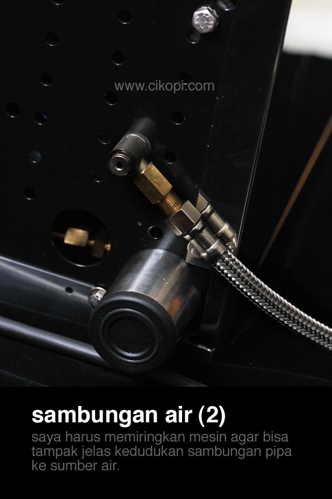 Sebelum masuk ke pembuatan espresso, saya akan berbagi cara kerja mesin Giotto Professional ini yang tidak menggunakan tangki air, tapi pipa yang tersambung langsung ke sumber air (plumbing). Sebelum disambungkan dengan listrik, pasang sambungan pipa air bersih dan saluran air kotor yang kesemuanya terletak di bawah mesinnya. Khusus untuk sumber air, masukan pipanya ke galon air mineral yang letaknya tidak terlalu berjauhan agar pompa tidak bekerja terlalu berat. Selanjutnya sambungkan ke listrik dan nyalakan mesin …