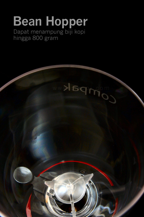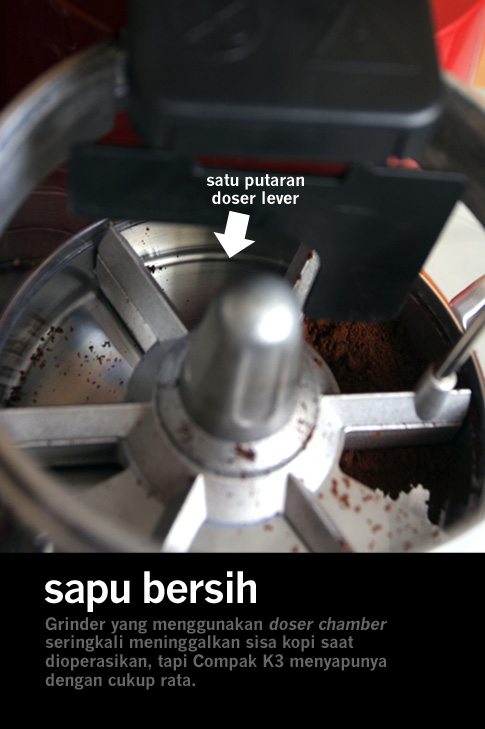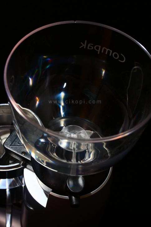 Saya belum membukanya, tapi menurut spesifikasi yang tertulis Compak K3 Elite menggunakan sistem flat burr dengan diameter 58mm, lagi-lagi sama dengan ukuran pisau Mazzer Mini.