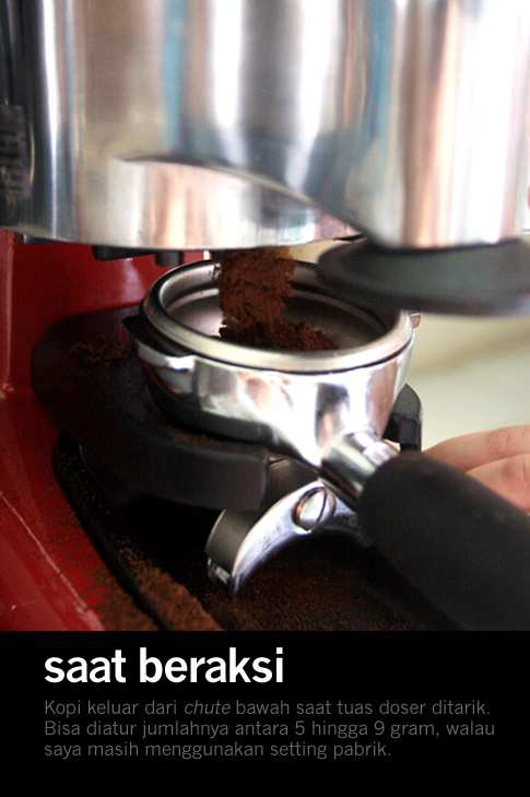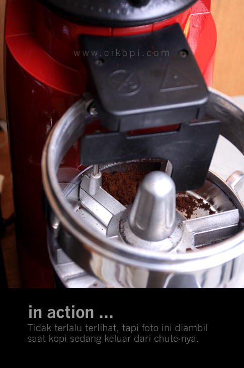 Beberapa hari grinder ini terus dicoba dan cukup mengenal karakternya, misalnya pergeseran maksimal sekitar plus minus 0.5 cm untuk espresso dari titik awal yang saya temukan. Satu hal yang membuat saya nyaman, hampir tidak pernah terjadi grinder berhenti mendadak karena biji kopi tersangkut. Putaran motornya yang tinggi, 1600 rpm bisa jadi faktor yang bisa menghindari kita melakukan pengosongan bean hooper untuk mengeluarkan kopi yang tersangkut.