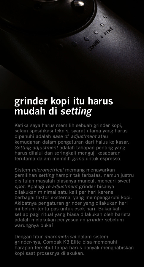 Kalau anda melihat situsnya, terlihat bahwa grinder Compak K3 Elite ini digolongkan untuk Home & Gourmet jadi bukan untuk penggunaan dengan frekuensi tinggi seperti di cafe yang menyajikan puluhan cup per jam-nya. Bukan artinya tidak bisa sama sekali, karena untuk warung kopi ukuran sedang, grinder ini bisa mencukupi kebutuhan.
