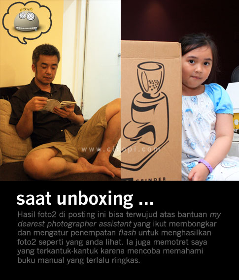 Oh ya, setiap pemotretan produk biasanya menghabiskan waktu hingga 3 hari, jadi baru pada hari keempat grinder ini mulai dicoba. Sambungkan ke listrik, dan mulailah test mendengar suara motornya yang bekerja tanpa biji kopi. Saat kopi mulai dimasukan, barulah raungan Compak K3 menunjukan kelasnya sebagai grinder yang suaranya mengingatkan saya pada Mazzer Super Jolly.