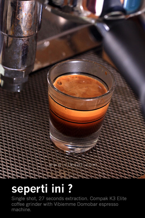 Satu putaran sambil mengira-ngira mungkin cup alumunium adalah comfort zone, saya menempatkannya tepat berada di tengah. Nyalakan mesin, dan Compak K3 sudah mengeluarkan kopi … akhirnya, sembari takut kalau2 mesin ini tepar.