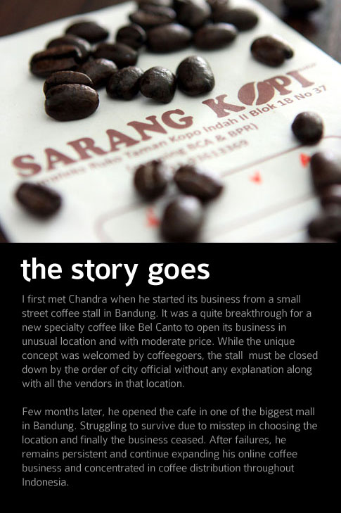 Wah akhirnya Sarang Kopi kembali lagi and more bel canto! kalo ke bandung ntar mampir sana deh. barusan tadi sore place order ke Mas Chandra untuk whole beans Gayo & Flores (Bajawa Highland) can’t wait to try it out. Toraja Kalosi nya sudah habis hehe.