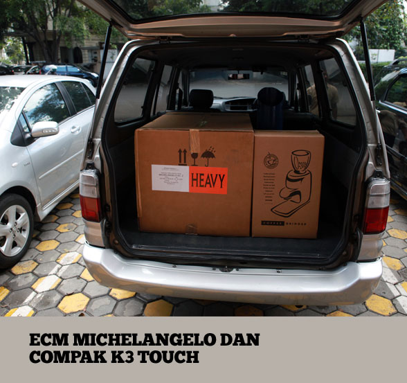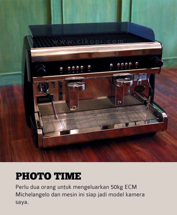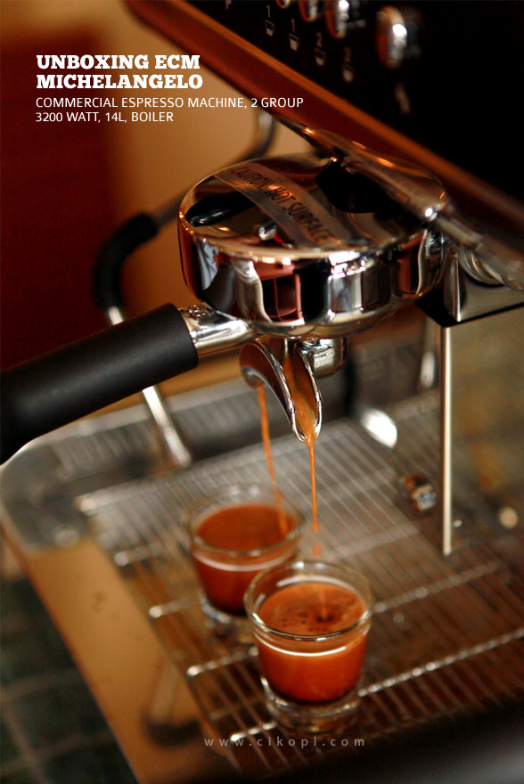 Tidak banyak komentar saya tentang mesin yang baru saja trial ini, tapi jarak antara group head dengan dip tray akan lebih baik kalau dilengkapi dengan fitur dudukan atau tatakan khusus untuk espresso shot tepat di tengahnya. Selebihnya, inilah ECM Michelangelo mesin kelas komersial pertama yang tampil di blog ini yang saya unbox bersama rekan Hendri Kurniawan “tukang nongkrong” sekaligus menjadi dewan penasihat dengan bendera “Espresso1st”di cafe ini. Salam.