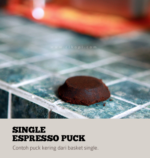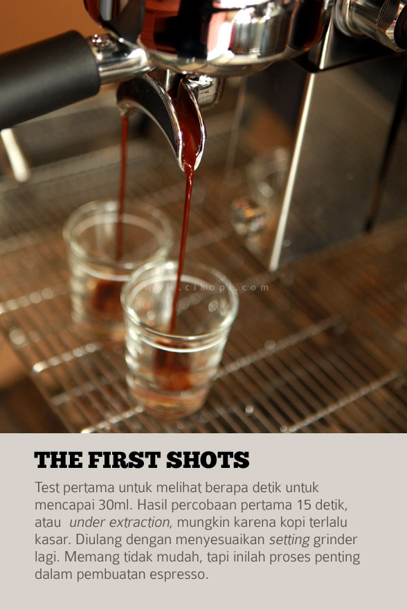 Brewing atau shots pertama harus diulang karena masih under extract, cairan espresso memenuhi gelas shots di bawah 20 detik. Shots kedua sebagaimana foto di atas sudah mencapai 30ml dalam waktu 25 detik, angka keramat saya.