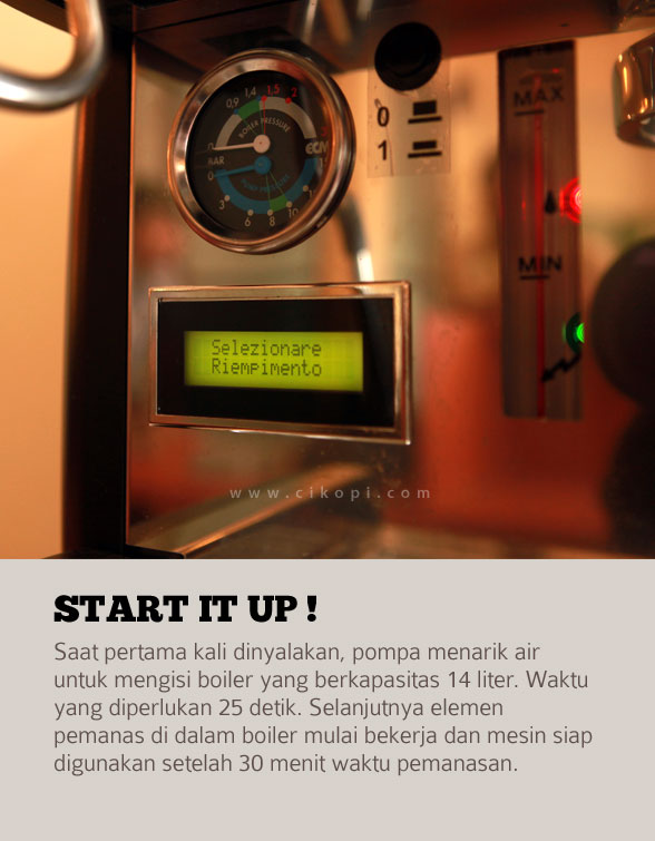 - Pompa mulai menyedot air ke dalam boiler tapi elemen pemanas belum bekerja, sebuah mekanisme safety agar mesin tidak overheat.