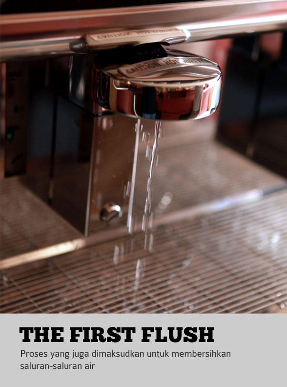 - Flushing beberapa kali dengan menggunakan portafilter dan membuka steam wand.