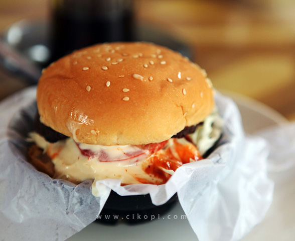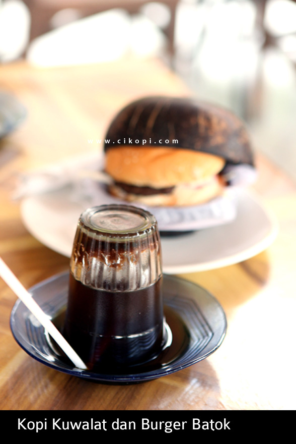 Pertama sedotan ditekuk dan dimasukan ke dalam gelas kopi, lalu tatakannya dipindah ke atas gelas. Dengan gerakan cepat kopi sudah berpindah dalam posisi terbalik seperti foto di atas. Inilah Kopi Kuwalat, sebuah penyajian kopi ala Burger Batok di jalan Swadaya, Duren Sawit, kawasan Kalimalang, Jakarta Timur. Sudah setahun lebih mereka menyajikan menu kopi jagoan mereka dan menjadi salah satu ikon minuman di restoran ini. Dijual seharga 4 ribu per gelas, relatif murah walau rasa kopinya silakan dicoba sendiri. Buka setiap hari dari jam 10 pagi hingga 11 malam dengan pengunjung bervariasi termasuk keluarga yang mengajak anak-anak mereka. Kopi Kuwalat menambah lagi wawasam saya akan kekayaan metode penyajian kopi di Indonesia yang tidak terbatas pada cara konvensional. Sambil menikmati cheeseburger (12rb) yang saya rekomendasikan untuk mengganjal perut di sore hari dan singkong goreng, kudapan pas untuk kopi ini. Enjoy the pictures !