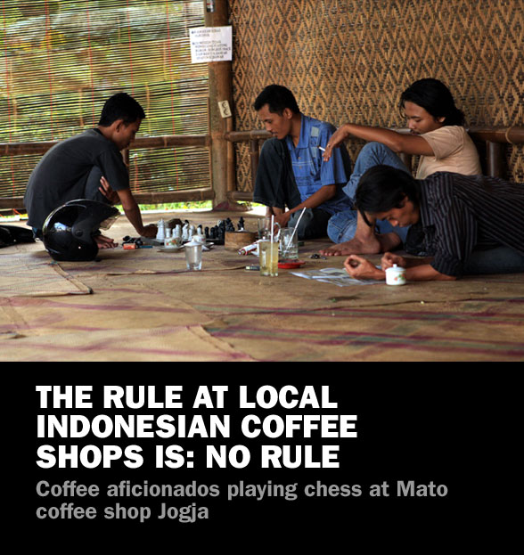 The rule at local Indonesian coffee shops is: no rule. One can freely lay down, or just playing chess or cards for many hours. No dress code required, you can laugh, chat or even sleep. Sometimes the owner is so overly generous and reluctant to wake up the customers should they fall asleep until sun rise.