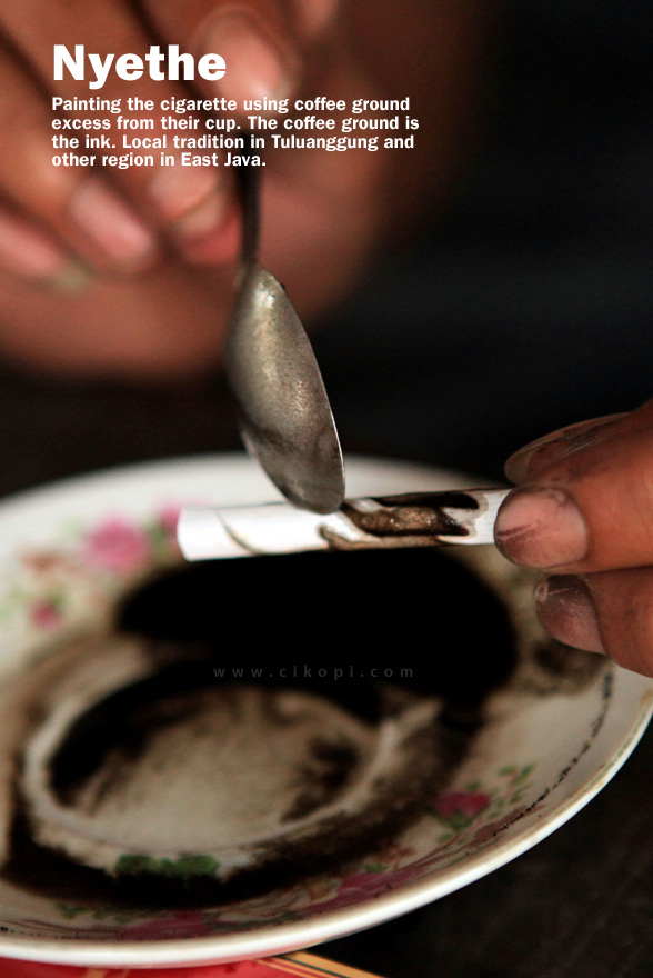 Drinking coffee at Waris is about the life of young men of about 18 – 25 years old. It is so much about how this tradition has been passed on since generations. It is also sometimes about watching and making funny or nasty comments on the gossip program on the television. More importantly, it is about ritual called Nyethe. It is a local term means painting the cigarette using coffee ground excess from their cup. The coffee ground is the ink.