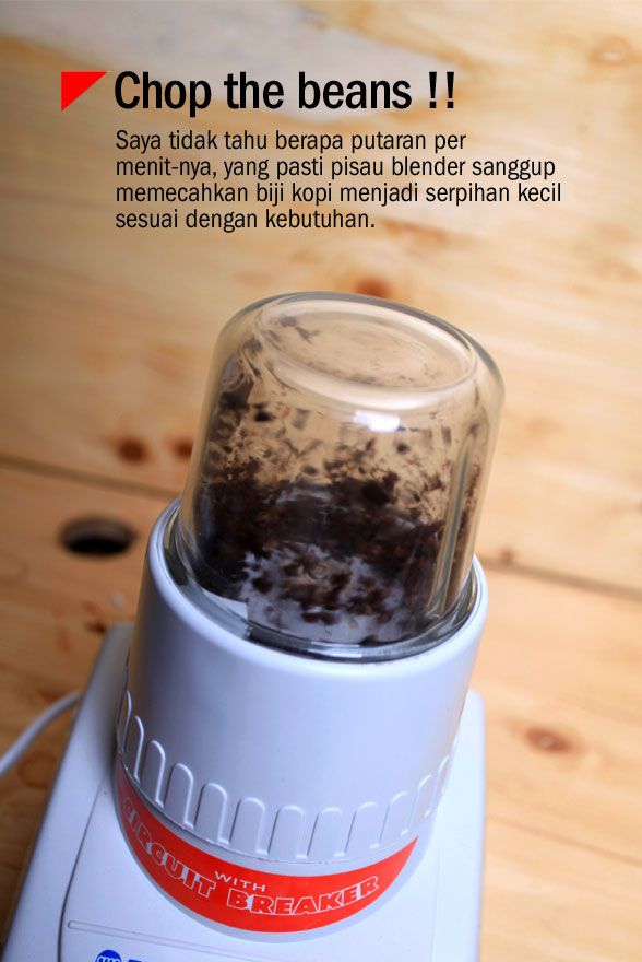 Alat rumah tangga seperti blender bukan diperuntukan untuk menggiling kopi, tapi tidak dilarang apabila ingin mencobanya menghaluskan kopi seperti yang dilakukan oleh orang tua saya. Ini alat minimal apabila terpaksa harus menggiling kopi karena ketiadaan grinder yang sistemnya chop atau membelah bukannya grind sebagaimana pada penggiling dengan mata pisau burr. Tidak terlalu direkomendasikan, tapi lumayan buat pengisi kekosongan sambil menunggu budget anda cukup membeli grinder kopi yang pantas untuk kebutuhan kafein sehar-jari.
