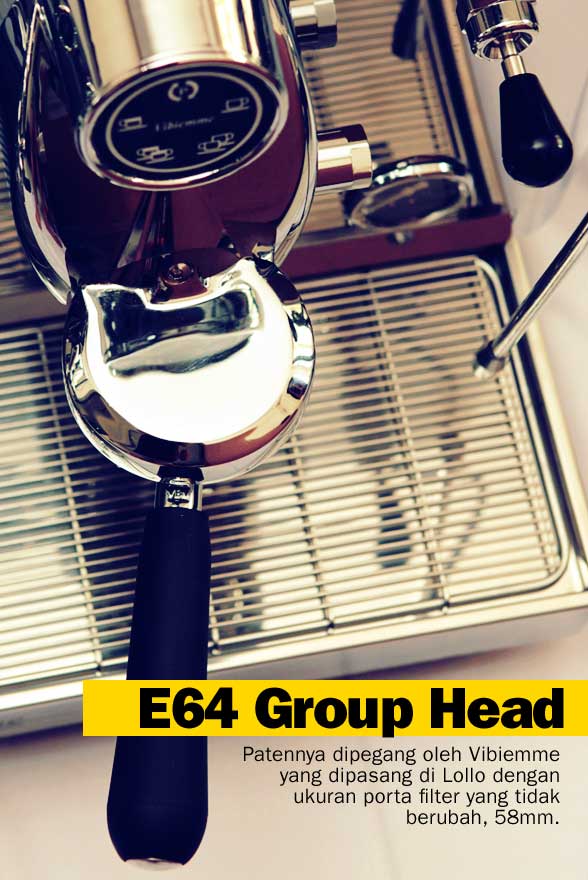 Berbeda dengan tipe Vibiemme lainnya yang menggunakan group head E61, tipe Lollo memasang kepala E64 di mesin yang beratnya 65kg ini. Perbedaan ini secara kasat mata memang tidak terlalu mencolok, dan tidak ditemukan penjelasan apapun kelebihan dari grouphead E64 di buku manual mereka.