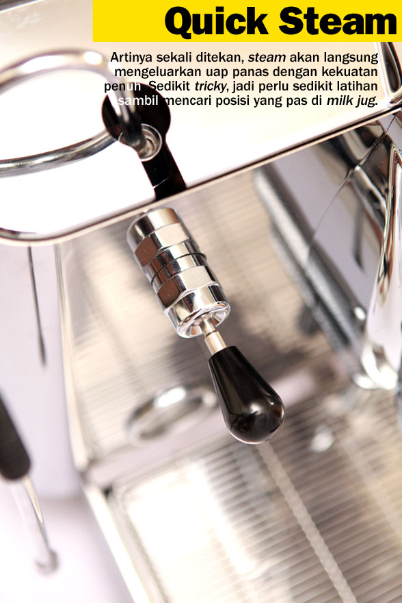 Quick steam sangat powerful dan pengaturannya harus ditekan secara perlahan apabila tidak ingin microfoam latte berubah dengan cepat.