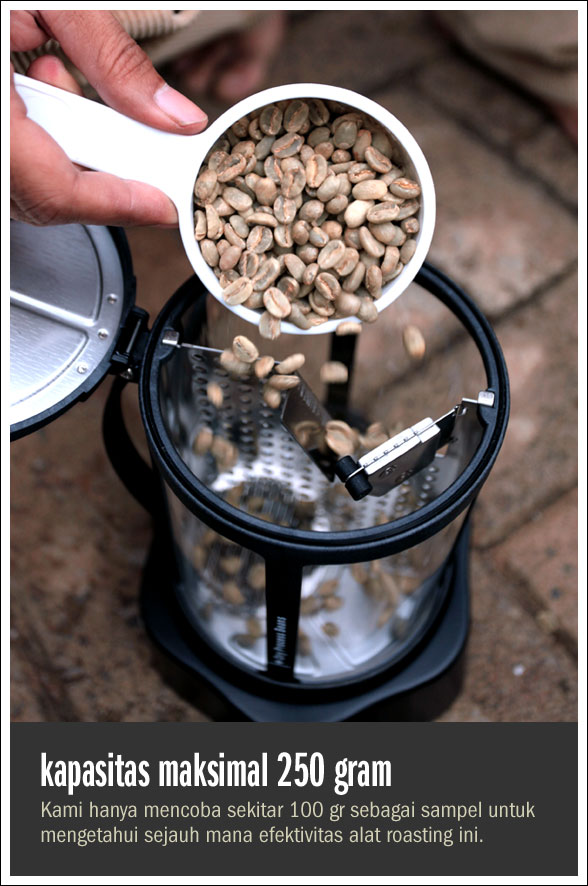 Setiap tahapan proses-nya bisa dilihat secara jelas saat perubahan warna berlangsung karena drum-nya menggunakan material kaca tahan panas. Alat inilah yang kami jadikan percobaan untuk melihat sejauhmana efektivitas-nya dalam melakukan roasting. Ya, di pinggir jalan.