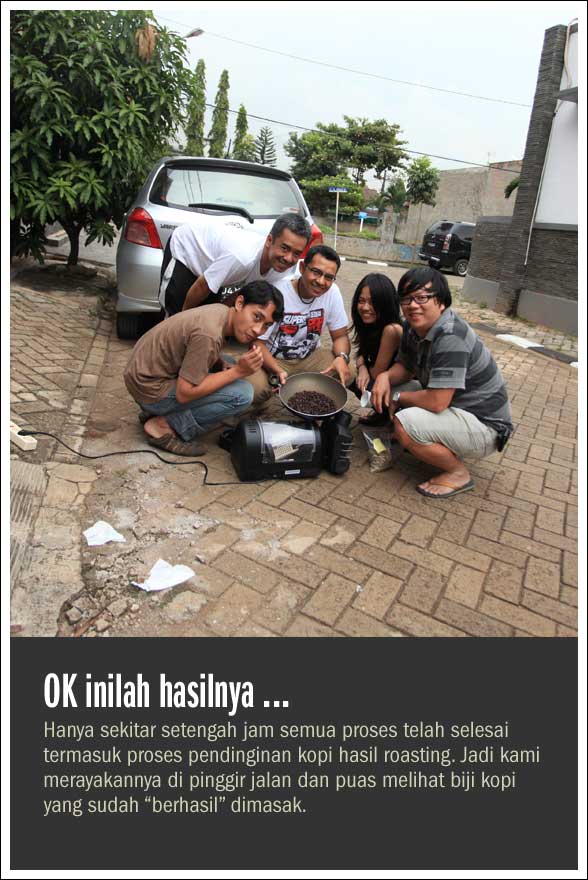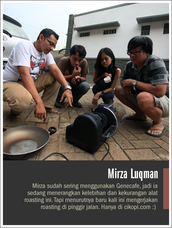 Jadilah sore itu bersama rekan penikmat kopi Hendri, Vianne, Yudis, dan Mirza nongkrong di pinggir jalan depan rumah saya untuk melakukan roasting dengan Gene Cafe.