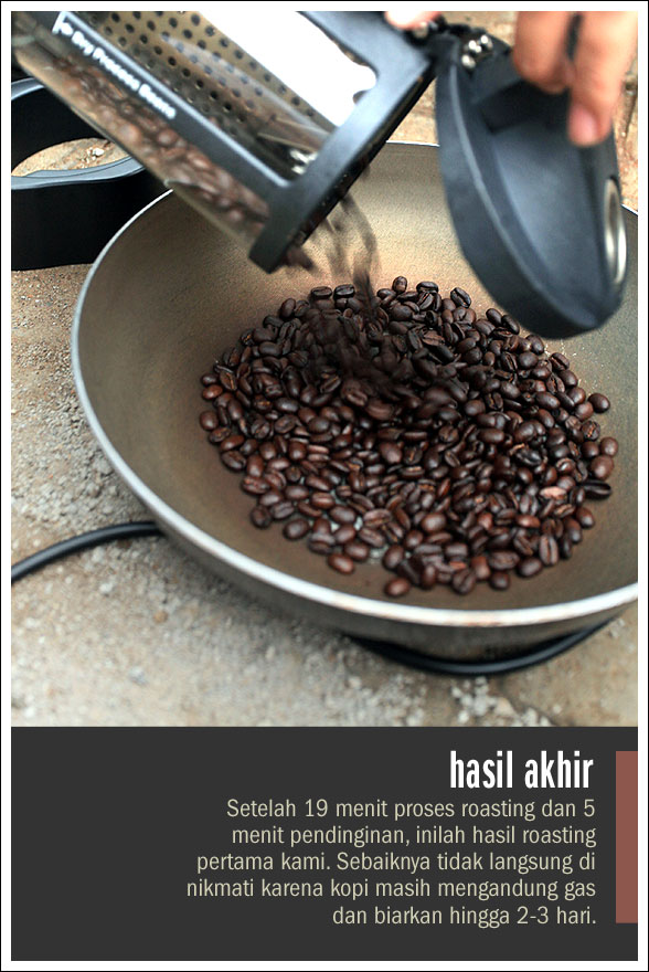Sebenarnya kopi yang baru di roast masih mengandung gas dan sebaiknya didiamkan beberapa waktu hingga berhari-hari sebelum dinikmati. Tapi karena keburu ingin tahu, kami langsung mencoba hasil roasting pinggir jalan tadi sore dan dinikmati bersama-sama.