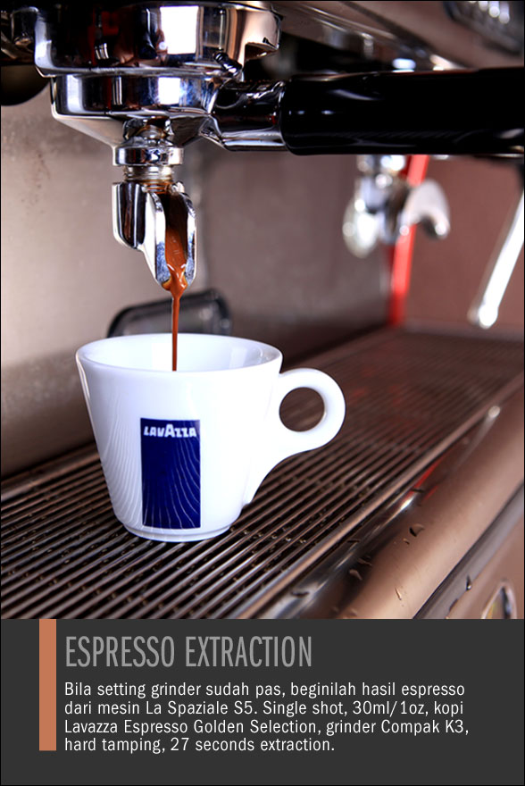 Grinder Compak K3 yang sekarang nongkrong di bar bersama satu grinder kelas prosumer merek Latina buatan Taiwan (akan di ulas khusus) dijadikan teman untuk melihat kinerja mesin ini. Kopi menggunakan Lavazza Golden Crema dan Lavazza Golden Selection yang apabila setting grinder-nya sudah tepat akan menghasilkan super crema, seperti pada foto2 espresso shot di ulasan singkat mesin dari perusahaan Tritama Kawanmas (Giotto, ECM Michaeangelo, dan Veneziano).
