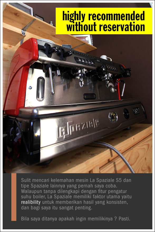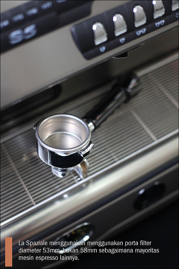 Secara pribadi saya selalu menikmati mesin La Spaziale terutama setiap pull espresso dari single basket portafilter-nya yang berdiameter 53mm dan berat 0.7 kg yang hampir tidak pernah mengecewakan (single portafilter 646 gr, double 690 gr). Itu hanya salah satu faktor yang membuat mesin ini sesungguhnya sangat layak ditampilkan dalam event sekelas kompetisi Barista semata karena saya setuju dengan tag line mereka : the perfect instrument for a perfect espresso.