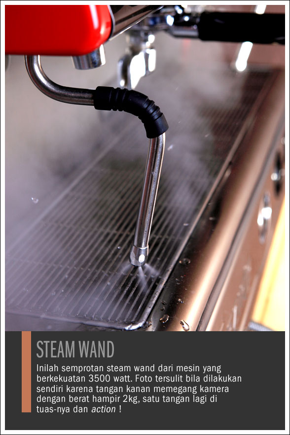 Frothing milk dilakukan dengan mudah karena steam wand bisa bergerak dengan bebas menghasilkan microfoam yang silky smooth dan terlihat jelas saat jug diputar perlahan. Saya berpendapat bahwa mesin La Spaziale sejauh ini merupakan yang terbaik dalam menghasilkan tekstur frothing untuk minuman milk based seperti cappuccino atau latte dibanding dengan mesin lain yang pernah saya coba.